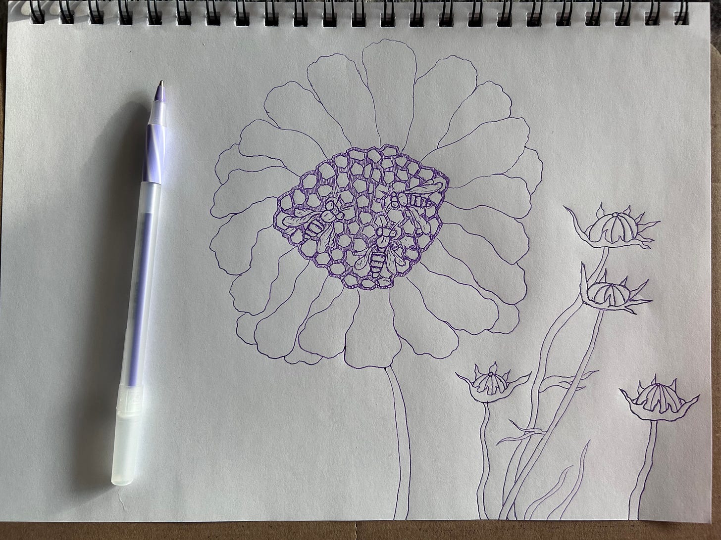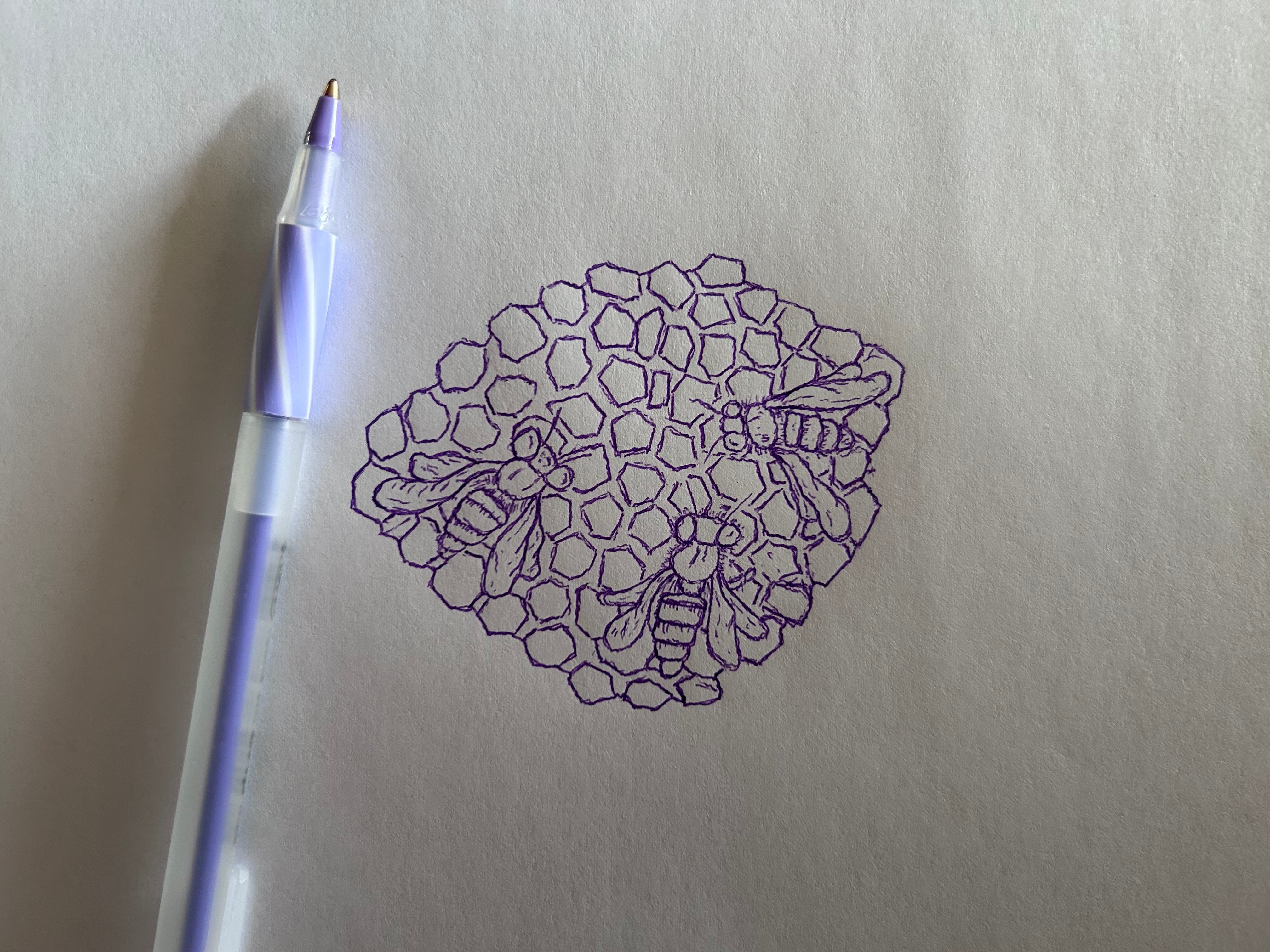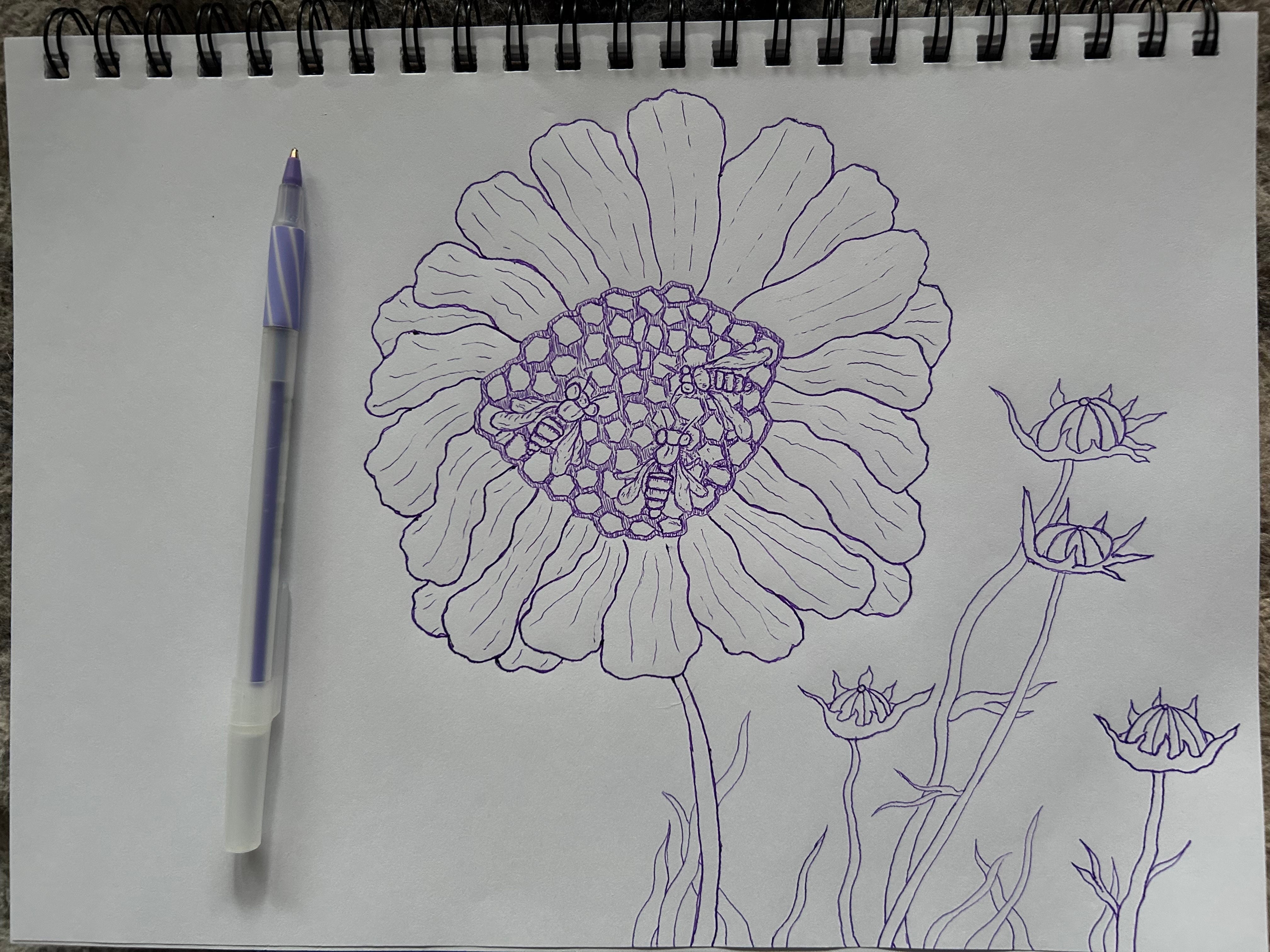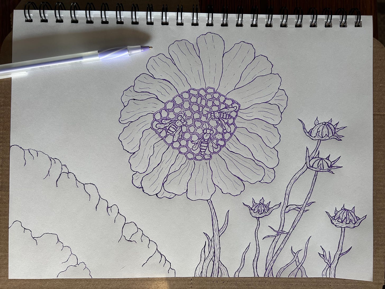 April 8, 9, 10 | Flower and Hive 8.5”x12” pen and ink